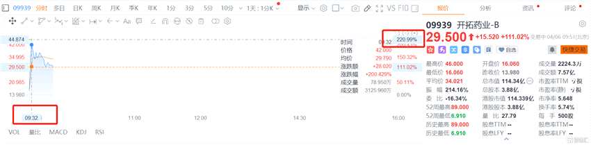 繼周一暴漲近37%后,開拓藥業(yè)今日9:30再度高開近15%報16.06港元,2分鐘后,資金一路猛攻孟打,開拓藥業(yè)暴漲220%,報46港元。