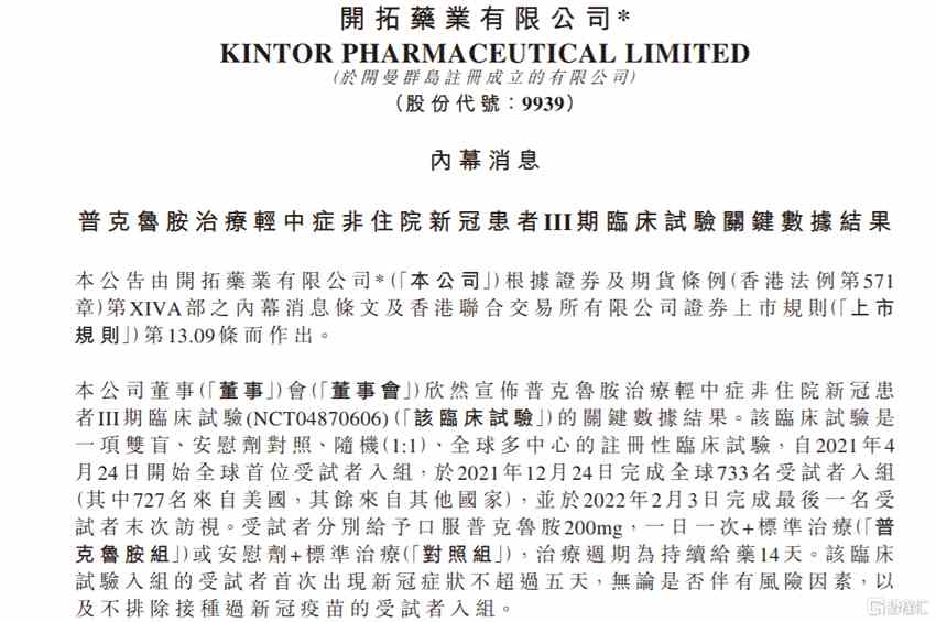 消息面上,4月6日,開拓藥業(yè)在港交所公告,公布了普克魯胺治療輕中癥非住院新冠患者III期臨床試驗(NCT04870606)的關(guān)鍵數(shù)據(jù)結(jié)果。