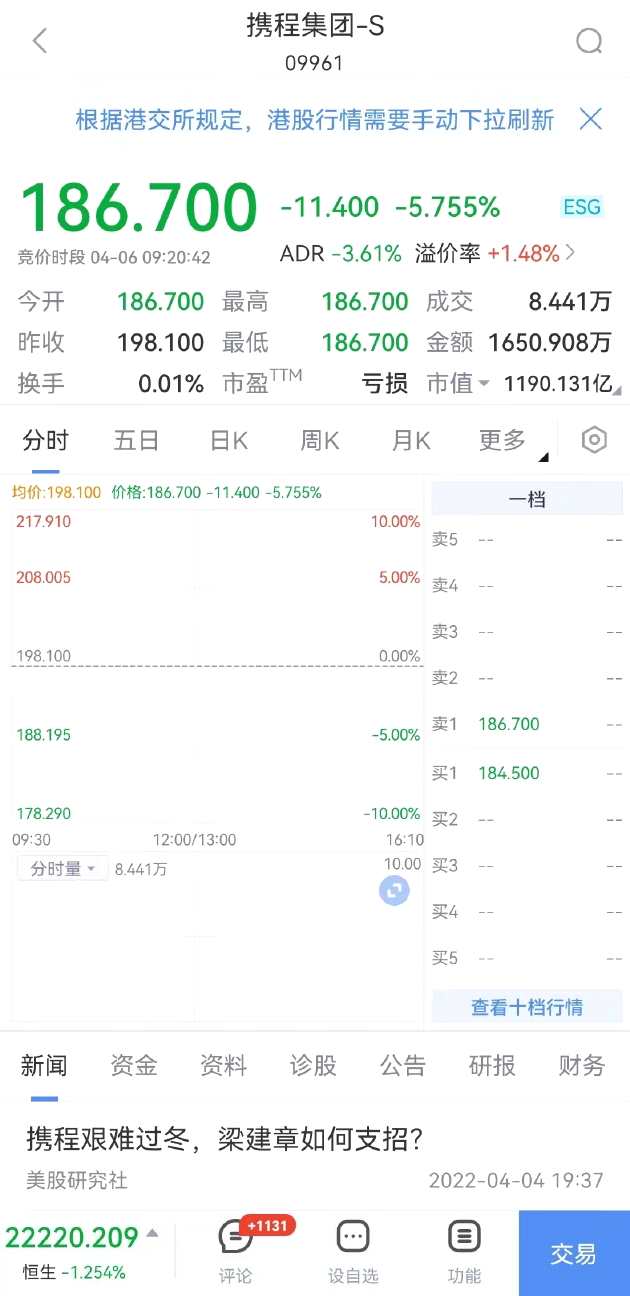 新浪科技訊 4月6日上午消息,恒指低開1.25%,恒生科技指數(shù)跌2.77%。 攜程跌5.75%,京東集團(tuán)跌5%;快手、網(wǎng)易、美團(tuán)跌超4%。