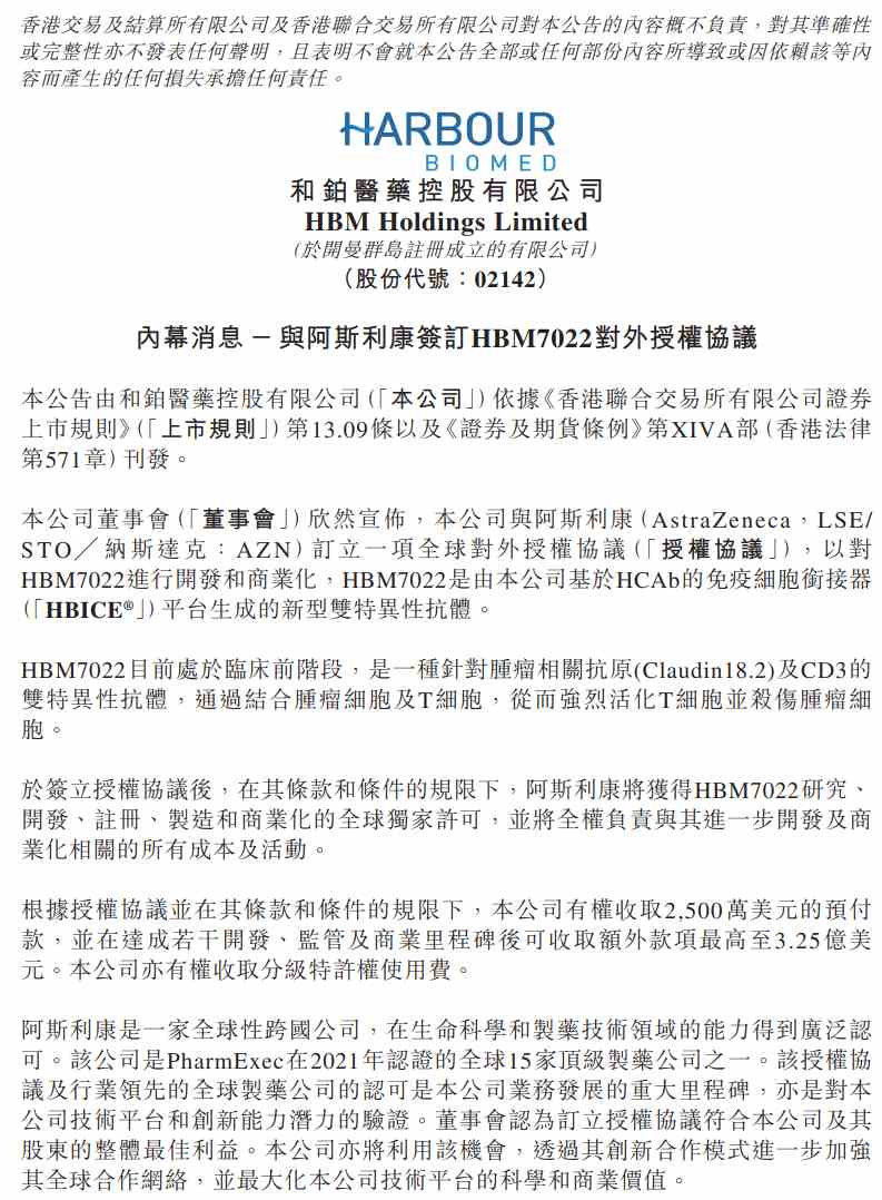 在授權(quán)協(xié)議后,阿斯利康將獲得HBM7022研究、開發(fā)、注冊、制造和商業(yè)化的全球獨家許可,并將全權(quán)負責與其進一步開發(fā)及商業(yè)化相關(guān)的所有成本及活動。