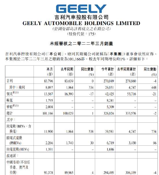 吉利汽車:2022年3月總銷量為101166部,較去年同期增長(zhǎng)約1%