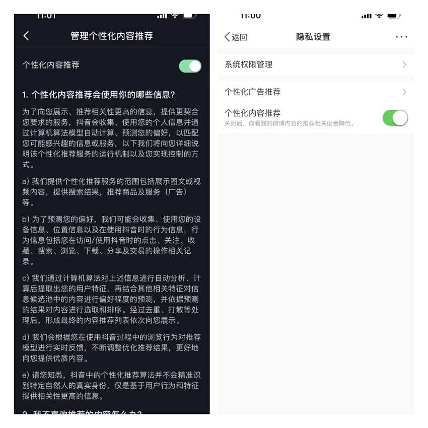 抖音與微博的個(gè)性化推薦設(shè)置頁面