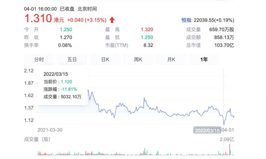 財報發(fā)布之后似乎并沒有引發(fā)市場上的波瀾,截至4月1日收盤,港股現(xiàn)代牧業(yè)每股價格來的1.3港元,總市值103.7億港元,對比去年每股2.12港元的股價高點跌去38%。