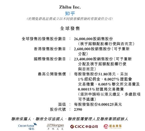 4月11日,知乎發(fā)布公告,全球發(fā)售2600萬股銷售股份,香港發(fā)售股份260萬股,每股發(fā)售股份最高51.80港元,股份代碼2390,每手100股,一手入場費5232.31港元,4月22日上市。