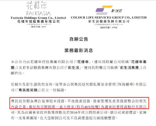 花樣年及彩生活發(fā)布聯(lián)合公告,彼等各自與粵民投另類私募基金管理(珠海橫琴)有限公 司(‘粵民投另類’)訂立一份協(xié)議。 粵民投另類為專注從事股本投資、不良資產(chǎn)投資、資產(chǎn)管理及產(chǎn)業(yè)資源整合的領(lǐng)先內(nèi)資企業(yè)?;浢裢读眍惖膯我蛔畲蠊蓶|(持有40%股權(quán))為廣東民營投資股份有限公 司,其為由廣東省政府指導(dǎo)推動及于2016年成立的投資公司。該公司資源豐富,并擁 有一支專業(yè)團隊,在大型財困公司及不良資產(chǎn)重組方面經(jīng)驗豐富。