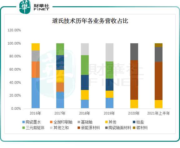 資料顯示,道氏技術(shù)成立于2007年,起初主營(yíng)釉面材料業(yè)務(wù),是國(guó)內(nèi)陶瓷材料龍頭。2016年,公司開(kāi)始布局新能源材料賽道,包括上游資源(鈷原料、鈷鹽)及三元前驅(qū)體、鋰電導(dǎo)電材料石墨烯和碳納米管導(dǎo)電劑等關(guān)鍵材料。目前,公司已形成了“鋰電材料+碳材料+陶瓷材料”的產(chǎn)業(yè)布局。