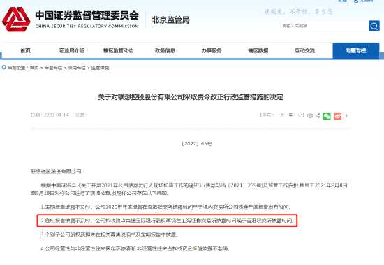 摘要: 中國(guó)證監(jiān)會(huì)北京監(jiān)管局發(fā)布關(guān)于對(duì)聯(lián)想控股股份有限公司采取責(zé)令改正行政監(jiān)管措施的決定,處罰的原因涉及四個(gè)方面。其中,北京證監(jiān)局表示,聯(lián)想控股個(gè)別子公司股權(quán)質(zhì)押未在相關(guān)募集說明書及定期報(bào)告中披露。