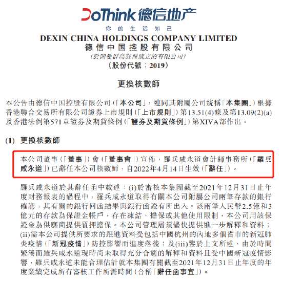 剛剛,德信中國發(fā)布公告,羅兵咸永道會(huì)計(jì)師事務(wù)所(‘羅兵咸永道’)已辭任公司核數(shù)師,自2022年4月14日生效(辭任)。