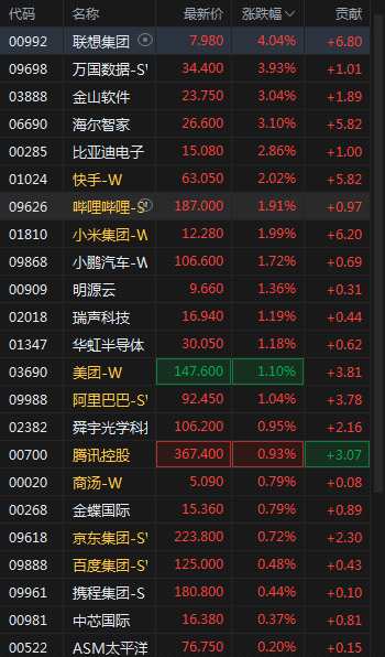 恒生科技指數(shù)漲幅擴(kuò)大至1% 聯(lián)想集團(tuán)漲超4%比亞迪電子漲近3%