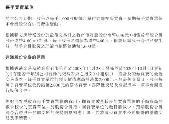 于本公告日期,股份以每手1,000股股份之單位于聯(lián)交所買賣。預(yù)期每手買賣單位 不會因股份合并而發(fā)生變動。 根據(jù)聯(lián)交所所報股份于最后交易日之收市價每股股份港幣0.46元(相當(dāng)于每股合并 股份港幣4.60元)計算,每手股份之價值為港幣460元,假設(shè)建議股份合并已經(jīng)生 效,每手合并股份之理論市值將為港幣4,600元。
