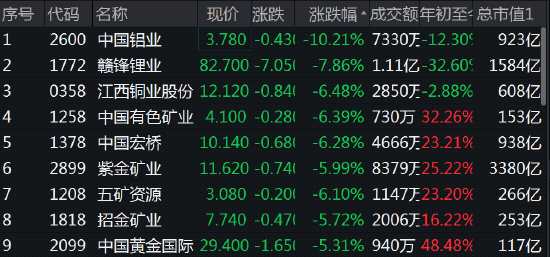 有色股普跌,中國鋁業(yè)跌超10%,贛鋒鋰業(yè)跌近8%