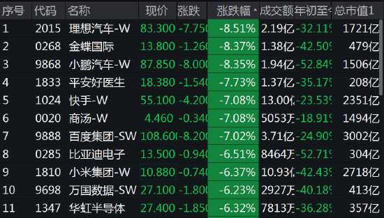 港股跌幅擴(kuò)大,恒生科技指數(shù)跌超5%,恒指跌近4%,報(bào)19840點(diǎn),理想汽車(chē)、金蝶國(guó)際、小鵬汽車(chē)等跌超8%,快手、商湯等跌超7%,小米、阿里跌6%,騰訊跌超4%。