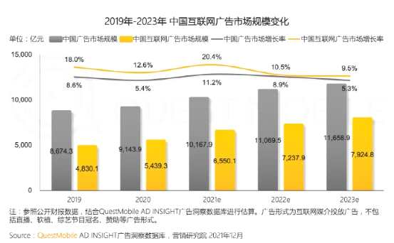 回顧2021年,受諸多客觀因素影響,互聯(lián)網(wǎng)廣告行業(yè)不少頭部玩家的增長承受一些考驗(yàn)。根據(jù)第三方機(jī)構(gòu)QuestMobile發(fā)布的《2021中國互聯(lián)網(wǎng)廣告市場(chǎng)洞察》,2021年中國互聯(lián)網(wǎng)廣告市場(chǎng)規(guī)模6550.1億元,增長率20.4%。