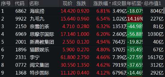 港股消費股集體爆發(fā),海底撈漲近7%,九毛九、奈雪、思摩爾漲超6%,新高教集團(tuán)、貓眼娛樂、李寧、特步等漲超4%。