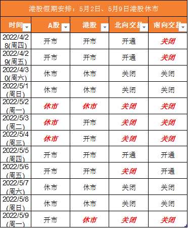 5月6日起北向滬股通和深股通暫停交易,5月10日恢復(fù)交易,5月9日南向港股通關(guān)閉,5月10日恢復(fù)。