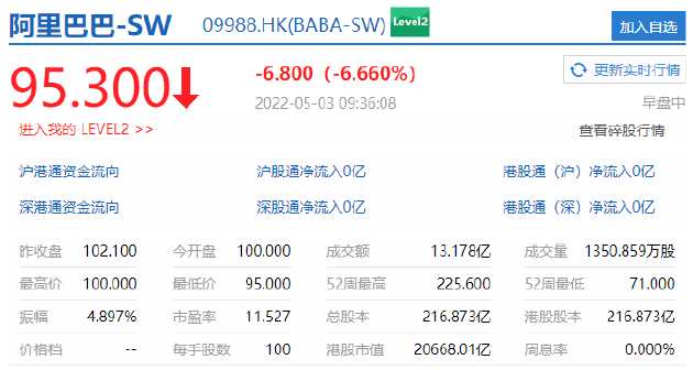 新浪科技訊 5月3日上午消息,港股走低,阿里巴巴跌幅擴(kuò)大至7%,恒生科技指數(shù)一度跌近3%。