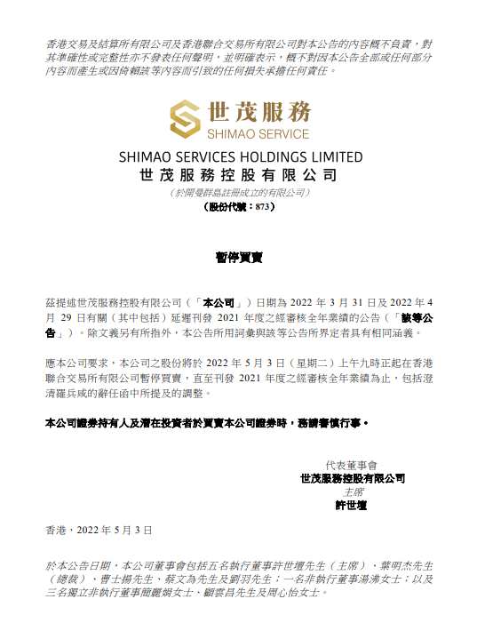 世茂服務(wù)5月3號(hào)起停牌 直至刊發(fā)2021年度之經(jīng)審核全年業(yè)績(jī)