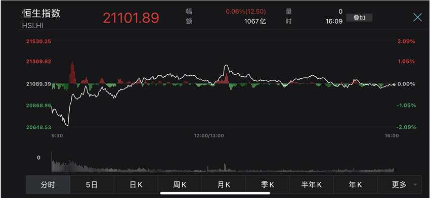 截至收盤,恒指漲0.06%報21101.89點;恒生國企指數跌0.43%報7267.25點。