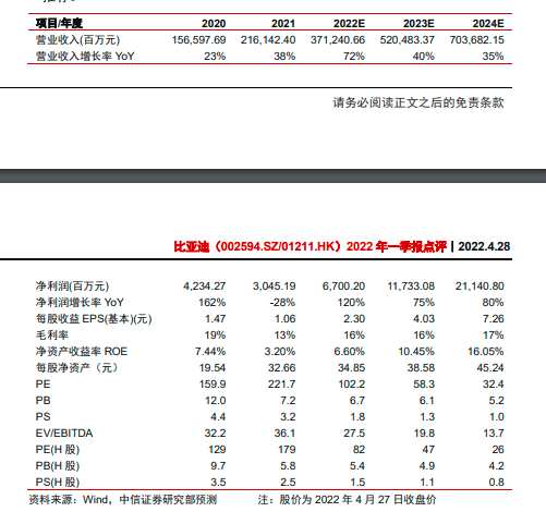 中信證券袁健聰4月28日發(fā)布研報,維持公司2022/23/24年歸母凈利潤預(yù)測為67/117/211億元,現(xiàn)價對應(yīng)A股PE102/58/32倍,對應(yīng)H股82/47/26倍。按分部估值法,參照可比公司平均估值,分別給予2022年公司造車/動力電池/控股比亞迪電子/電動供應(yīng)鏈6062/3194/658/874億元估值,加總得公司合理價值10,935億元,對應(yīng)A/H股目標(biāo)價375.6元/462.9港元,維持公司(A+H股)“買入”評級,繼續(xù)重點推薦。
