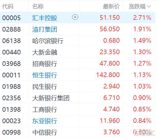 港股銀行股拉升 匯豐控股漲超2%