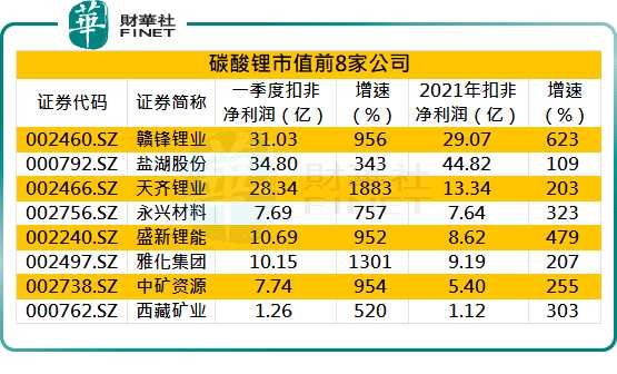 另一個(gè)盈利大戶是碳酸鋰企業(yè)。財(cái)華社統(tǒng)計(jì),碳酸鋰市值前8名公司2021年業(yè)績(jī)大幅增長(zhǎng),8家公司全部實(shí)現(xiàn)翻倍式增長(zhǎng),其中,贛鋒鋰業(yè)(002460)(002460.SZ)年度扣非凈利潤(rùn)增幅超過(guò)6倍,鹽湖股份(000792.SZ)扣非凈利潤(rùn)超過(guò)40億元。2022年一季度,以上8家碳酸鋰公司業(yè)績(jī)?nèi)繉?shí)現(xiàn)加速增長(zhǎng),其中贛鋒鋰業(yè)、天齊鋰業(yè)(002466)(002466.SZ)、永興材料(002756)(002756.SZ)、盛新鋰能(002240.SZ)、雅化集團(tuán)(002497)(002497.SZ)、【中礦資源(002738)、股吧】(002738)(002738.SZ)和西藏礦業(yè)(000762)(000762.SZ)今年一季度扣非凈利潤(rùn)已經(jīng)超過(guò)去年全年水準(zhǔn)。