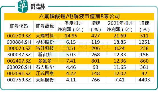 在價(jià)格暴漲驅(qū)動(dòng)下,A股六氟磷酸鋰公司業(yè)績(jī)暴增。財(cái)華社統(tǒng)計(jì),六氟磷酸鋰/電解液市值前8名公司2021年業(yè)績(jī)大幅增長(zhǎng),其中翻倍式增長(zhǎng)成為普遍現(xiàn)象,龍頭天賜材料(002709)(002709.SZ)年度扣非凈利潤(rùn)超過(guò)20億元。2022年一季度,以上8家六氟磷酸鋰/電解液公司業(yè)績(jī)進(jìn)一步增長(zhǎng),扣非凈利潤(rùn)同比增速普遍超過(guò)100%,龍頭天賜材料增速超過(guò)4倍,扣非凈利潤(rùn)近15億元。