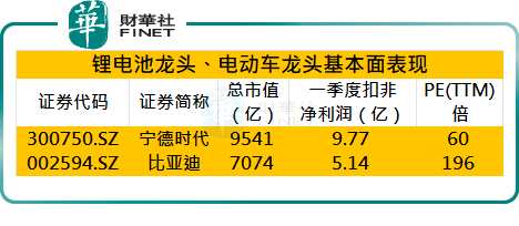 財(cái)華社統(tǒng)計(jì),截至2022年4月30日,寧德時(shí)代、比亞迪最新總市值分別為9541億元、7074億元,對(duì)應(yīng)市盈率分別為60倍、196倍(如果根據(jù)一季報(bào)業(yè)績(jī)推算動(dòng)態(tài)市盈率,則鋰電池龍頭和電動(dòng)車龍頭的市盈率會(huì)更高。),二者一季度扣非凈利潤(rùn)分別為9.77億元、5.14億元。