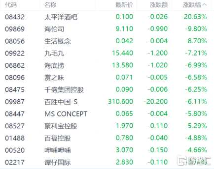 餐飲板塊集體下跌。太平洋(601099)酒吧跌超20%,海倫司跌超9%,九毛九跌、海底撈、呷哺呷哺等跟跌。消息面上,高盛此前發(fā)表中國(guó)餐飲股報(bào)告,鑒于新冠疫情影響行業(yè)的復(fù)蘇前景和宏觀經(jīng)濟(jì)不確定性,該行將對(duì)中國(guó)餐飲服務(wù)行業(yè)2021年至2026年收入復(fù)合增長(zhǎng)預(yù)測(cè),從此前的11%下修至8%,并預(yù)計(jì)行業(yè)2022年將停滯不前,僅同比增長(zhǎng)0.6%,并估計(jì)隨社交距離措施放寬下,料行業(yè)于2023年及2024年將可同比各增長(zhǎng)14.5%及10%。