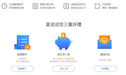 而根據(jù)富途官網(wǎng),目前開設(shè)賬戶、入金與轉(zhuǎn)倉皆可享有如免傭、送美股股票卡等不同程度優(yōu)惠。