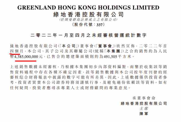 5月12日,綠地香港控股有限公司(簡稱:綠地香港,337.HK)發(fā)布2022年1月至4月之未經(jīng)審核營運(yùn)統(tǒng)計(jì)數(shù)字顯示,綠地香港董事會宣布,2022年前4個(gè)月,該公司、其子公司及其聯(lián)屬公司之合約銷售約為人民幣43.85億元,同比減少56.1%;已售合約總建筑面積則約為491,505平方米。