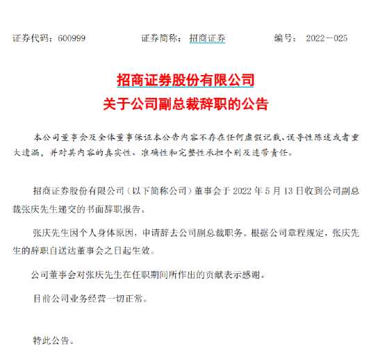 招商證券副總裁張慶因身體原因辭職 剛?cè)肼毠?年多現(xiàn)年50歲