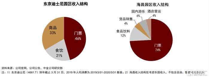 不難發(fā)現(xiàn),迪士尼、環(huán)球影城等主題樂(lè)園收入并非十分倚重門(mén)票,門(mén)票、餐飲、商品呈現(xiàn)三足鼎立的情況,這也是長(zhǎng)期以來(lái)看到的共識(shí)。以東京迪士尼樂(lè)園為例,