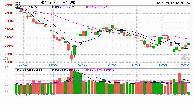 5月17日消息,隔夜美股繼續(xù)走跌,道指上漲26.76點,至32223.42點,漲幅0.08%。標準普爾500指數(shù)下跌0.39%,盤中一度下跌0.99%。納斯達克綜合指數(shù)下跌1.2%。今日開盤,恒指高開1.22%,報20193.6點,國企指數(shù)漲1.52%,紅籌指數(shù)漲0.72%。