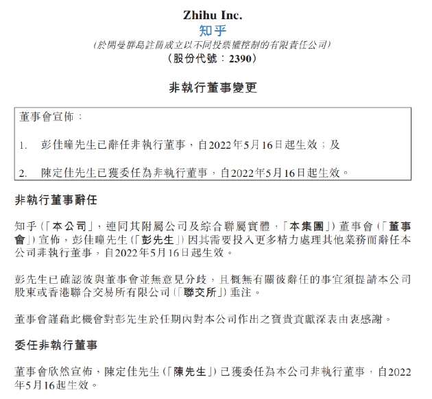知乎:委任陳定佳為非執(zhí)行董事 彭佳瞳辭任