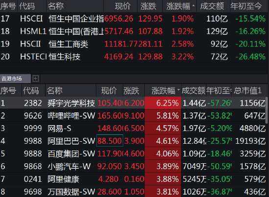 恒生科技指數(shù)漲超3%,舜宇光學(xué)漲6%,嗶哩嗶哩漲近6%,網(wǎng)易、阿里、百度漲超4%,小鵬、萬國(guó)數(shù)據(jù)等漲近4%,騰訊漲超3%。