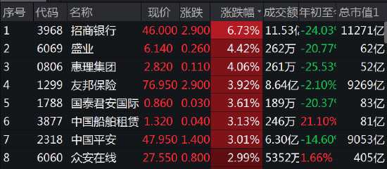 銀行股爆發(fā), 招行大漲近7%,友邦保險(xiǎn)漲4%,中國平安漲超3%,國泰君安(601211)國際漲3.6%,港交所漲3%。