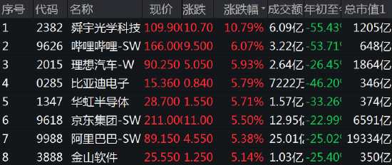 恒生科技指數(shù)漲4.24%,舜宇光學(xué)漲超10%,嗶哩嗶哩、理想汽車漲6%,京東集團(tuán)、阿里巴巴漲超5%,網(wǎng)易、小米、百度等漲超4%,摩根大通今日集體上調(diào)多家互聯(lián)網(wǎng)公司評級,對騰訊控股評級上調(diào)至超配,目標(biāo)價(jià)由265港元上調(diào)至470港元;對阿里巴巴也上調(diào)至超配,港股阿里巴巴目標(biāo)價(jià)由75港元上調(diào)至130港元,美股阿里巴巴目標(biāo)價(jià)由75美元上調(diào)至130美元。