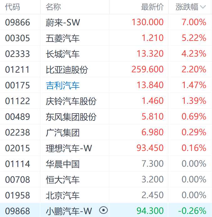 5月18日訊(編輯 胡家榮)今日早盤汽車股延續(xù)前期漲勢,多數(shù)汽車股持續(xù)走高,其中蔚來-SW(09866.HK)、五菱汽車(00305.HK)漲幅超5%。