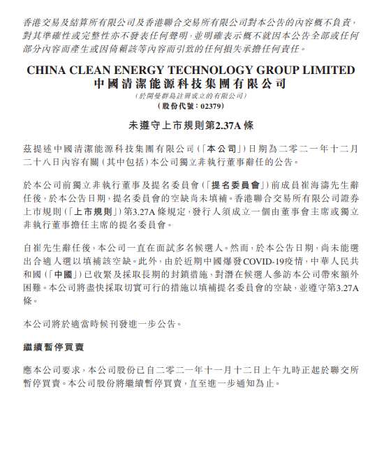 中國清潔能源科技:提名委員會(huì)的空缺尚未填補(bǔ) 違反了港交所證券上市規(guī)則