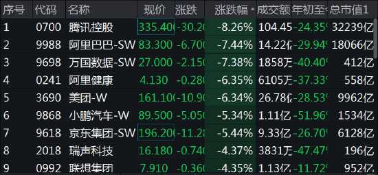 恒指跌幅擴大至3.5%,再度失守20000點關口,報19939點;騰訊控股跌超8%,成交超100億港元;恒生科技指數跌近5%,阿里巴巴、萬國數據跌超7%,阿里健康、美團跌超6%,京東跌超5%。