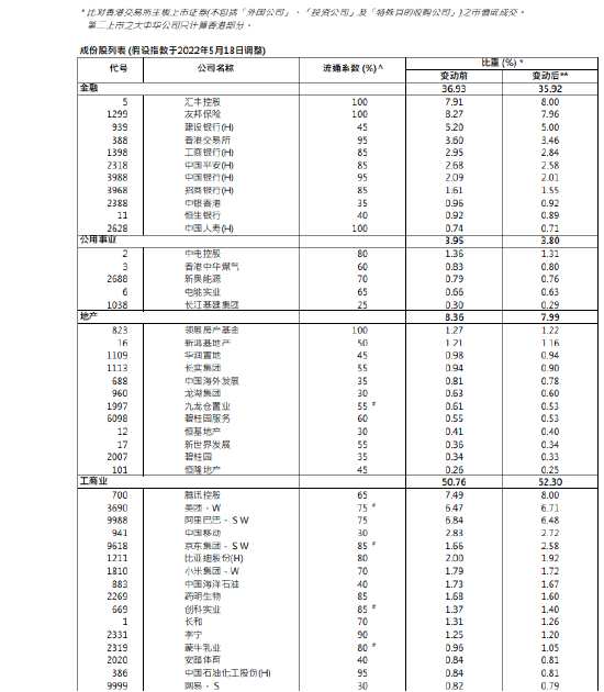 5月21日消息,5月20日,港股公布季度檢討結(jié)果,相關(guān)變動6月13日生效,其中,匯豐控股、騰訊控股權(quán)重提升至8%,美團權(quán)重上升,阿里巴巴、小米、友邦保險、港交所等權(quán)重下調(diào)。
