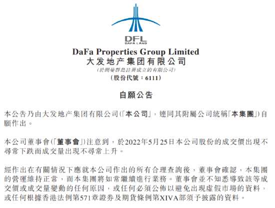 昨日大發(fā)地產暴跌66%,大發(fā)地產晚間公告稱,大發(fā)地產董事會確認集團的營運維持正常,將如常繼續(xù)進行業(yè)務。其董事會并不知悉導致該等成交價或成交量變動的任何原因,或任何必須公布以避免出現(xiàn)虛假市場的資料,或任何根據(jù)香港法例第571章證券及期貨條例第XIVA部須予披露的資料。