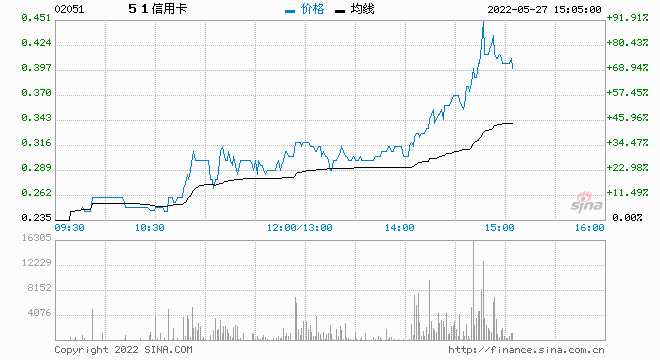 5月27日消息,51信用卡持續(xù)拉升,現(xiàn)漲82.98%,報(bào)0.43港元,最新市值5.841億港元。