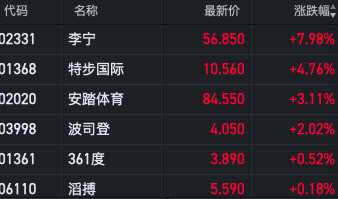 5月30日消息,體育用品股上漲,李寧漲近8%,特步國際漲近5%,安踏體育漲超3%,波司登漲超2%。