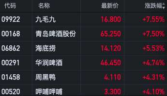 快訊:餐飲股上漲 九毛九、青島啤酒漲近8%海底撈漲近6%