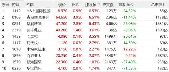青島啤酒、華潤啤酒漲超6%,蒙牛乳業(yè)、周黑鴨等漲超3%。