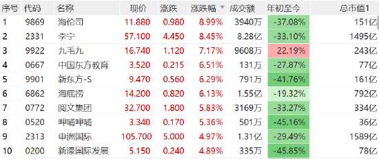 消費(fèi)股方面,海倫司、李寧等漲超8%,九毛九漲超7%,中國東方教育、新東方、海底撈等漲超6%。