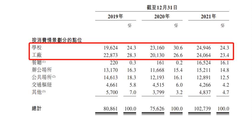 友寶在線絕大多數(shù)的點位均位于高客流量地區(qū),例如學校、工廠、餐廳、辦公場所、公共場所及交通樞紐。其中,學校點位占比2019-2021年分別為24.3%、30.6%、24.3%,工廠點位占比2019-2021年分別為28.3%、26.6%、23.4%。