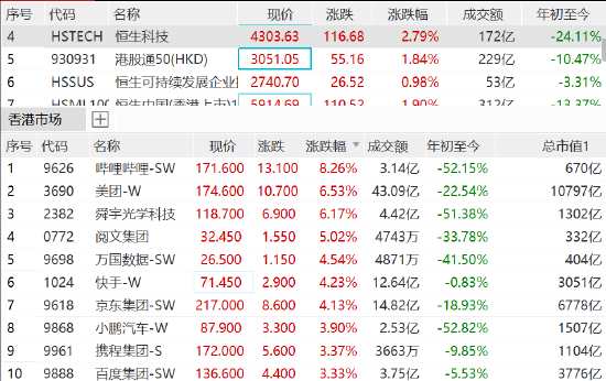 恒生科技指數(shù)漲幅擴(kuò)大至2.8%,嗶哩嗶哩大漲逾8%,美團(tuán)漲6.5%,快手、京東集團(tuán)漲超4%,攜程、百度等漲超3%。
