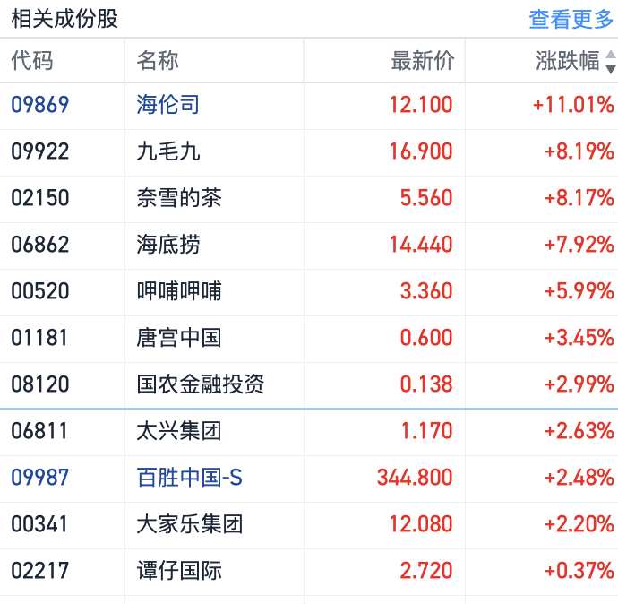 個股層面,小酒館海倫司(09869.HK)以11%領漲港股餐飲板塊,奈雪的茶(02150.HK)和九毛九(09922.HK)漲幅也超8%。